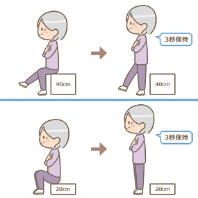 できた方→10㎝ずつ低い台に移り、片脚ずつテストします。左右とも片脚で立ち上がれた一番低い台がテスト結果です。