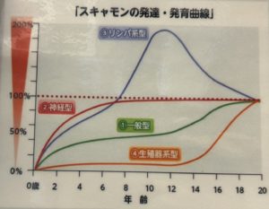 これはスキャモンの発育曲線と言って、人間の身体の発達を、一般型、神経型、リンパ系型、生殖器系型の4つに分類し年齢による成長の度合いを表したものです!